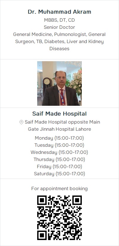 Liver and Kidney Diseases, General Surgeon, TB, Diabetes, PulmonologistSaif Made Hospital, Saif Made Hospital opposite Main Gate Jinnah Hospital Lahore (1) Contact: 03062999849, 03054998887, 03074111647