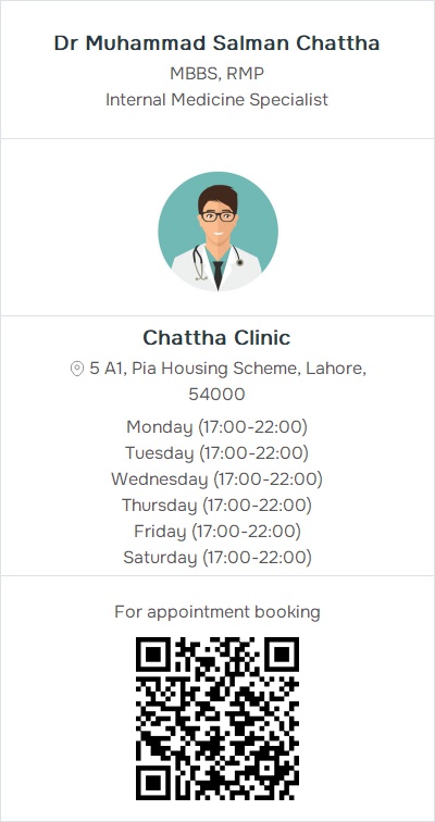 Internal Medicine SpecialistChattha Clinic, 5 A1, Pia Housing Scheme, Lahore, 54000 (1) Contact: 03062999849, 03054998887, 03074111647