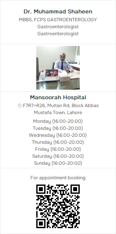GastroenterologistMansoorah Hospital, F7R7+R26, Multan Rd, Block Abbas Mustafa Town, Lahore (1) Contact: 03062999849, 03054998887, 03074111647