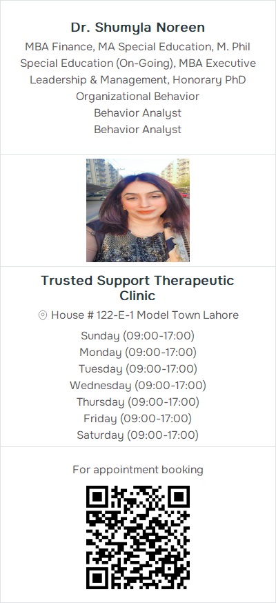 Behavior Analyst, AutismTrusted Support Therapeutic Clinic, House # 122-E-1 Model Town Lahore (1) Contact: 03062999849, 03054998887, 03074111647