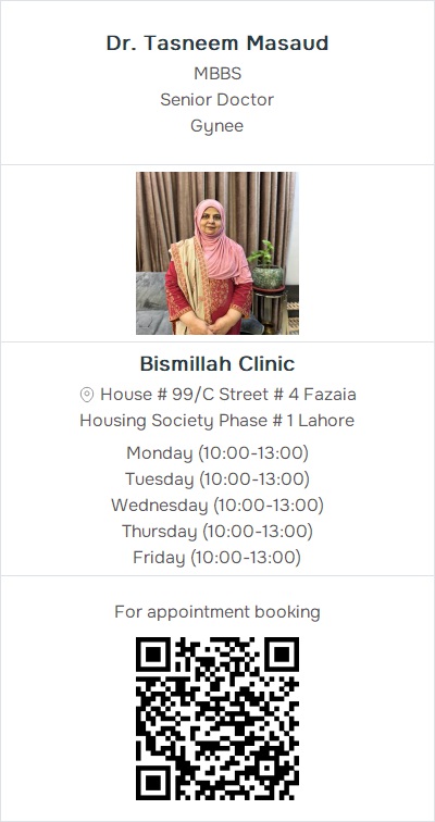 Gynecologists & Obstetrics گائناکالوجسٹBismillah Clinic, House # 99/C Street # 4 Fazaia Housing Society Phase # 1 Lahore (1) Contact: 03062999849, 03054998887, 03074111647